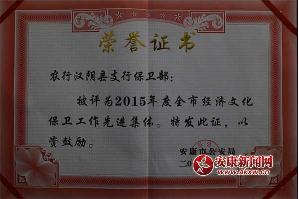 安康新聞網(wǎng)訊 (通訊員 吳玄杰)近日,陜西省公安廳、省綜治委聯(lián)合下發(fā)了《關(guān)于命名表彰2015年度全省經(jīng)文保系統(tǒng)省級(jí)“平安示范單位”“平安單位”的決定》,農(nóng)行漢陰縣支行被授予省級(jí)“平安單位”榮譽(yù)稱號(hào)。同時(shí),安康市公安局下發(fā)了《安康市公安局關(guān)于表彰2015年度全市經(jīng)濟(jì)文化保衛(wèi)工作先進(jìn)集體和先進(jìn)個(gè)人的決定》,農(nóng)行漢陰縣支行保衛(wèi)部獲得“2015年度全市經(jīng)濟(jì)文化保衛(wèi)工作先進(jìn)集體”榮譽(yù)稱號(hào),保衛(wèi)部經(jīng)理鄺吉祥同志被市公安局評(píng)為“先進(jìn)個(gè)人”。