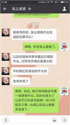 學(xué)校建立了學(xué)生德育成長(zhǎng)檔案,對(duì)“德育作業(yè)”實(shí)行“學(xué)生自我評(píng)價(jià)、家長(zhǎng)評(píng)價(jià)、老師評(píng)價(jià)”三級(jí)評(píng)定制度。按照完成情況實(shí)行等級(jí)評(píng)價(jià),每級(jí)評(píng)定最低可給一顆星,最多可給五顆星,德育作業(yè)完成情況實(shí)行一周一評(píng)定,一學(xué)期一匯總,根據(jù)德育作業(yè)完成情況年終評(píng)選星級(jí)少年。各班主任與學(xué)生家長(zhǎng)建立了微信群,在交流學(xué)生學(xué)習(xí)情況的同時(shí),家長(zhǎng)還通過微信群及時(shí)向老師反饋“德育作業(yè)”完成情況和評(píng)價(jià)結(jié)果。