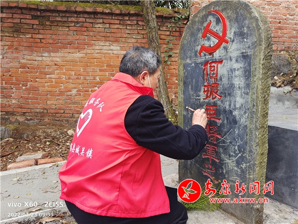 活動(dòng)現(xiàn)場(chǎng),該鎮(zhèn)10余名書法志愿者們向烈士鞠躬后,便小心翼翼地把墓碑上面的灰塵刷去,開始嚴(yán)肅認(rèn)真地一筆一劃為烈士墓碑描摹碑文。每一筆,都刻畫了志愿者們對(duì)先烈們的沉痛追思;每一畫,都描摹著對(duì)新生活的無限感激。經(jīng)過3個(gè)多小時(shí)的努力,40余座革命烈士墓碑的字跡煥然一新,在陽光的照耀下,顯得格外清新醒目,志愿者們露出了欣慰的表情。