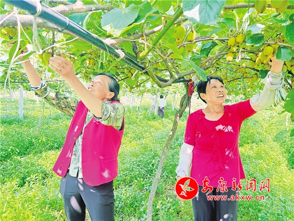 走進(jìn)觀音河鎮(zhèn)水田村獼猴桃種植基地,放眼望去,片片綠葉下,一個(gè)個(gè)果型飽滿、大小勻稱的獼猴桃掛滿枝頭。陽(yáng)光透過(guò)片片綠葉,照射在青黃色的果實(shí)上,清新的果香隨風(fēng)四溢。