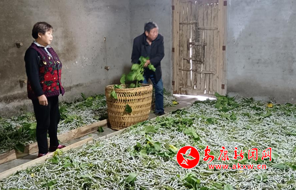 在南窯村家庭養(yǎng)殖合作社,蠶子正趕上四齡期,每天要吃三遍桑葉,早上要上山采摘桑葉,采回來后要進(jìn)行清洗、消毒,然后再給蠶喂,蠶桑合作社負(fù)責(zé)人王祖忙得不可開交。