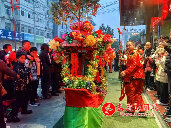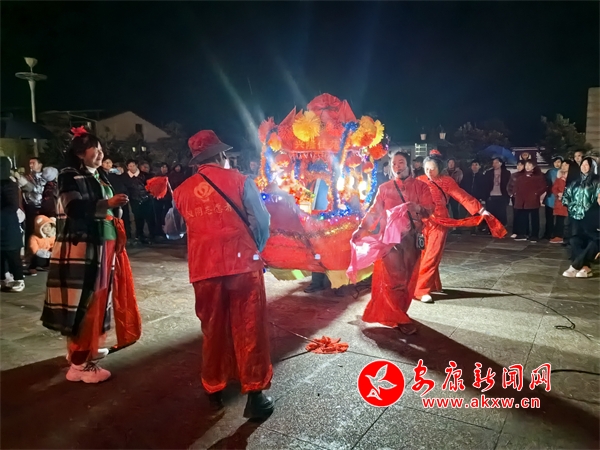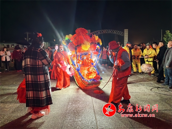 在位于漢陰縣平梁鎮(zhèn)的興隆佳苑社區(qū),春節(jié)期間,小區(qū)里處處洋溢著節(jié)日氛圍。夜幕降臨,社區(qū)廣場響起陣陣鑼鼓聲,;ù硌菡介_始。只見表演者雙手提船、配合默契,船體隨著“波浪”旋轉(zhuǎn)、顛簸,身穿喜慶艷麗的服裝、頭戴五彩頭飾的表演人員個個精神抖擻,一邊前行,一邊唱著漢陰本地的花鼓戲,祈求來年風調(diào)雨順、福壽安康。翻飛的彩扇、華麗的彩船,精心編排、詼諧幽默的表演,為社區(qū)群眾呈現(xiàn)了一場精彩的視覺盛宴。
