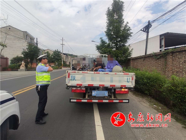7月31日15時許,大隊執(zhí)勤民警在316國道沿線開展路面巡邏,行至恒口東大門時,發(fā)現(xiàn)一輛號牌為皖AC***C號輕型欄板貨車后車廂有違規(guī)載人嫌疑,巡邏民警立即上前攔停,示意駕駛?cè)死钅衬惩\嚱邮軝z查。經(jīng)查,該貨車核定載人數(shù)為5人,實際載9人,貨車車廂違法載客4人,屬于貨車違法載客的嚴重交通違法行為。