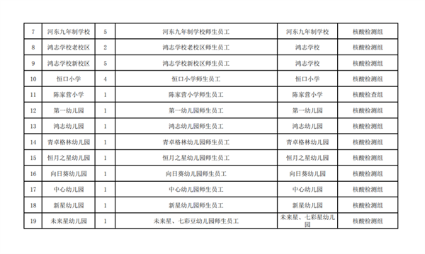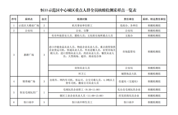 按行業(yè)、類別、區(qū)域,共設(shè)置19個采樣點、40個采樣臺(見附件),具體由各行業(yè)牽頭部門、責(zé)任單位統(tǒng)一安排采樣點設(shè)置、人員組織、秩序維護,檢測對象按照牽頭部門、責(zé)任單位的具體要求,分時段有序到指定地點進行采樣,避免人群聚集。