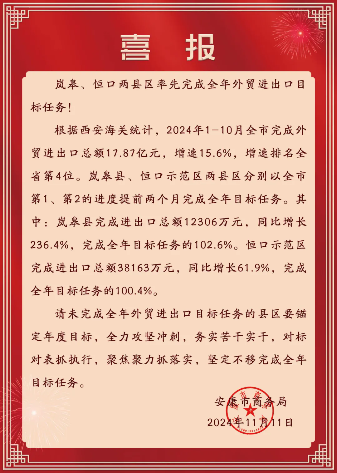 近日,市商務(wù)局發(fā)來(lái)喜報(bào),恒口示范區(qū)率先完成全年外貿(mào)進(jìn)出口目標(biāo)任務(wù)。