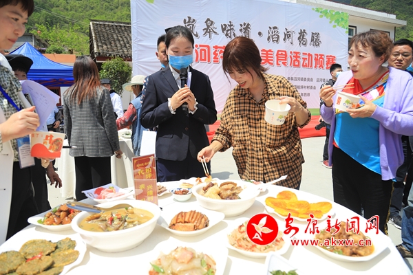 暢游清幽藥谷之鎮(zhèn),品嘗農(nóng)家藥膳美食。活動現(xiàn)場,人潮涌動,十分熱鬧。山藥燒排骨、槐花雞蛋、青蒿牛肉餅、香酥芍藥花、蠻子藥炒雞蛋……一道道現(xiàn)場烹飪制作的美食,極具本土特色,令人垂涎三尺……讓人“食”指大動,引得近千名村民和外地游客“味蕾大開”,爭相品嘗,舌尖上的鄉(xiāng)愁和美景第一次在這個四月深刻交融。