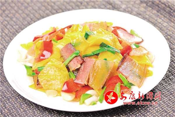 蛋皮炒臘肉是土生土長(zhǎng)的嵐皋菜.烹飪好的蛋皮炒臘肉色香味俱全。如黃金般閃耀的蛋皮、臘肉與如翡翠般碧綠的韭菜、青椒相得益彰,勾引著人的食欲。入口更有絲絲縷縷的濃香和淡辣,自齒喉彌漫而下,久久縈繞回蕩于五臟六腑間,讓人吃了還想吃,吃了便永生難忘。
