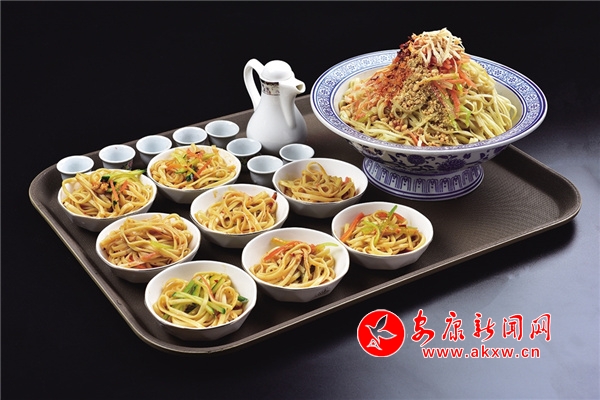 老街涼面:采用家傳手藝,主料為手工堿面,煮熟后用甘甜的冷水過涼,加飄香油辣子、秘制醋湯、蒜泥等精心調(diào)味,拌勻即成。堿面可改善人體微酸體質(zhì),醋湯解膩、醒酒,既可調(diào)味亦可單飲。青翠的黃瓜絲、嬌艷的胡蘿卜絲再加上引人垂涎的酸醋,一份老少皆宜的老街涼面余“味”繞梁。
