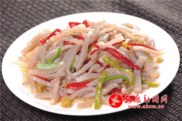 酸辣魔芋:是嵐皋特色名菜,也是當(dāng)?shù)胤沁z項(xiàng)目之一。以秋收后鮮魔芋漿汁為原料,加入堿水煮制,冷固后呈豆腐形狀,切塊后與當(dāng)?shù)嘏莶艘黄鸫蠡鸱炊。魔芋中?ldquo;堿”和泡菜中的“酸”完美結(jié)合,具有保護(hù)腸胃、排毒養(yǎng)顏、減肥瘦身的功效,同時(shí)還能降血糖、降血脂、降血壓。嵐皋民諺“要見好公婆,多吃鬼腦殼”,說的是姑娘吃了魔芋豆腐,瘦體健身、容光煥發(fā),能得到公婆的好感,F(xiàn)代醫(yī)學(xué)認(rèn)為,魔芋豆腐中含量最大的葡萄甘露聚糖,具有強(qiáng)大的膨脹力,超過任何一種植物膠的黏韌度,既可填充胃腸,消除饑餓感,又因所含熱量微乎其微,故能控制體重、減肥健美。此外,魔芋豆腐既能開胃化食,又能清除腸道垃圾,有防癌抗癌的神奇魔力,享有“防癌魔衣”“神奇食品”的美譽(yù)。