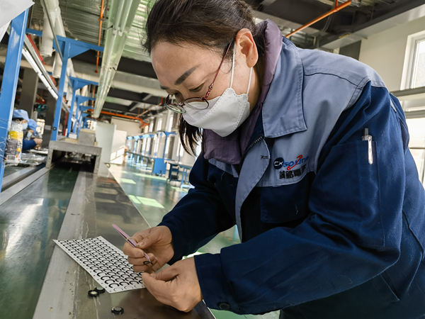 貼阻尼是啥活兒呢?為了滿足筆者的好奇心,龍饒慧就跟筆者做了介紹。原來,那是在音圈經(jīng)過盆架瓷碗打膠、防磁貼、磁鐵點膠、裝入華司、扣瓷規(guī)、磁組固化、脫瓷規(guī)、點PCB板固定膠后的一道工序。為了讓筆者看明白,龍饒慧還做了示范,只見他左手熟練捏起拇指大的揚聲器邊緣,右手用鑷子鉗起粘在紙板上的阻尼,很快地貼了上去,筆者看了一下時間,她完成整個動作剛好用了10秒。