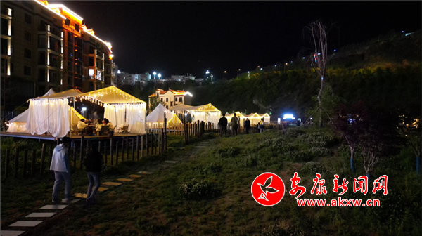 假期第一天,記者來到位于城關(guān)鎮(zhèn)羅景坪社區(qū)的嵐谷森野露營基地,只見藍天白云下,統(tǒng)一的白色帳篷在寬敞的草地上依次排開,游樂設(shè)施散布其間,人們或躺或臥,或游戲或拍照,一派快樂、安逸的假日氛圍。夜幕降臨,點點彩燈為夜晚的露營基地增添了一抹童話色彩,大家吹著徐徐晚風(fēng),吃著各色美食,享受著與家人朋友暢談暢飲的歡樂時光。