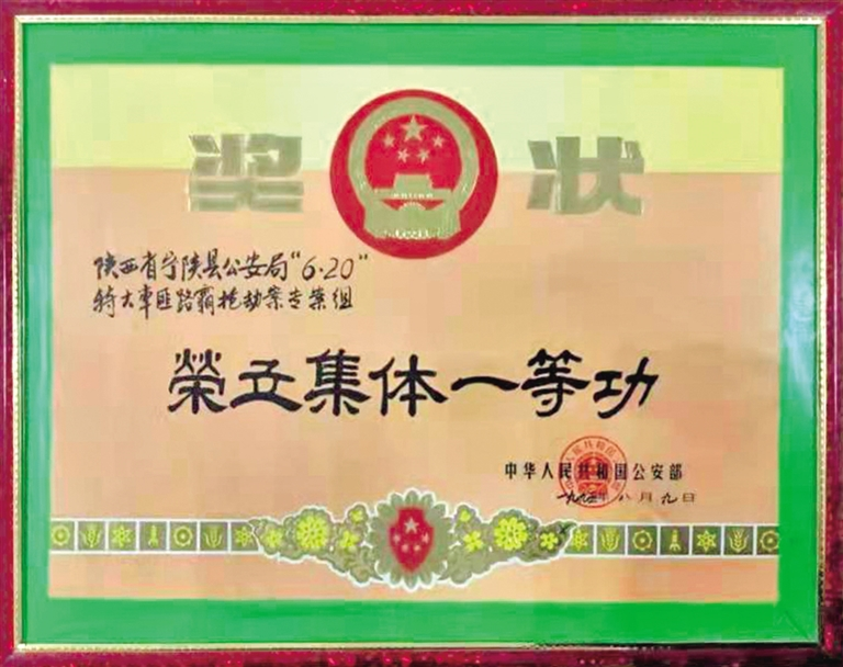 和往常一樣,我正和管理檔案的陳姨一起整理資料,忽然被眼前一塊榮立集體一等功的獎狀吸引,仔細查看,發(fā)現(xiàn)上面的詳細內(nèi)容是:陜西省寧陜縣公安局“6.20”特大車匪路霸搶劫案專案組榮立集體一等功,落款是中華人民共和國公安部,時間是1995年8月9日。