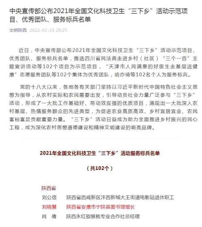 近日,中央宣傳部公布2021年全國文化科技衛(wèi)生“三下鄉(xiāng)”活動示范項目、優(yōu)秀團隊、服務(wù)標兵名單,推選四川省民法典走進鄉(xiāng)村(社區(qū))“三個一百”主題宣講活動等102個項目為示范項目,“天津市人民滿意的好醫(yī)生走基層送健康”志愿服務(wù)團隊等102個集體為優(yōu)秀團隊,哈亦琦等102名個人為服務(wù)標兵。其中,寧陜縣圖書館長劉曉慧獲評2021年全國文化科技衛(wèi)生“三下鄉(xiāng)”活動服務(wù)標兵。S58安康新聞網(wǎng)