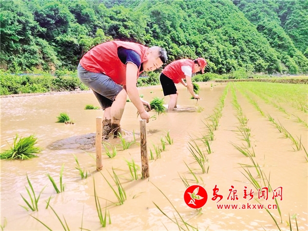 本網(wǎng)訊(通訊員 陳陽軍)農忙時節(jié)不等人。不久前,地處秦嶺腹地的寧陜縣龍王鎮(zhèn)棋盤村,有一群人,他們身穿“紅馬甲”搶抓好時節(jié)移栽秧苗,在水田里來回穿梭,幫助村民把一株株秧苗整齊有序地插入水田里,在藍天白云的映襯下,田間地頭呈現(xiàn)出一幅忙碌的夏耕畫卷。