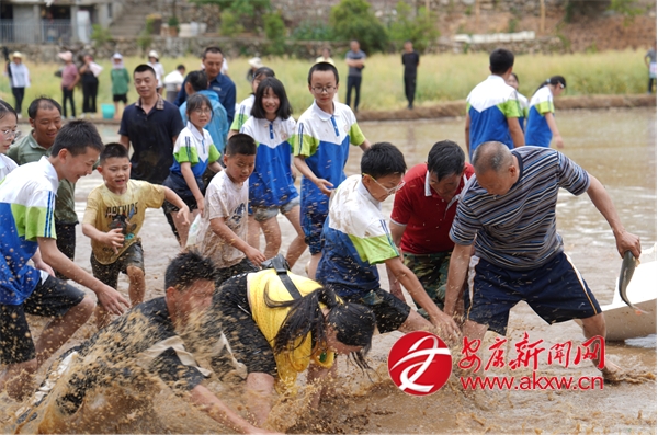 插秧比賽后緊接著開展了拔河比賽,參賽者們光著腳在泥濘的田里奮力拉扯,你來我往,互不相讓,田邊的觀眾則奮力地為自己支持的隊(duì)伍加油鼓勁。稻田抓鴨捕魚活動(dòng)讓現(xiàn)場氣氛更加熱烈,觀眾紛紛脫下鞋襪,卷起褲腿,在稻田中追逐游魚和鴨子,歡快的笑聲此起彼伏。