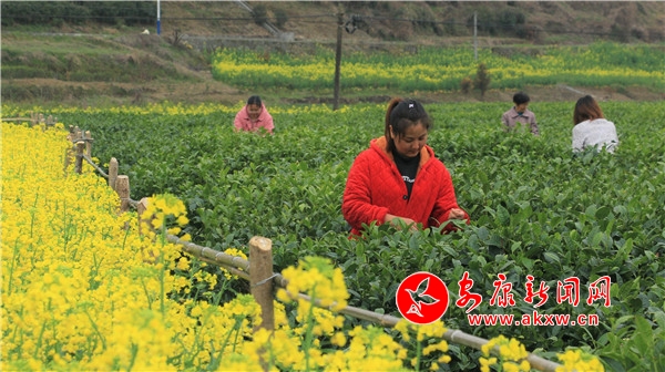 《采茶紀(jì)》的歌詞生動(dòng)活潑。清明雨后,一壟壟的茶樹(shù)上,剛露出的芽苞,透著嫩綠,毛茸茸的,甚是惹人憐愛(ài)。在平利縣洛河鎮(zhèn),蔥郁的茶園、忙碌的茶農(nóng)和亮麗的油菜花田構(gòu)成一幅美麗的春日畫(huà)卷。