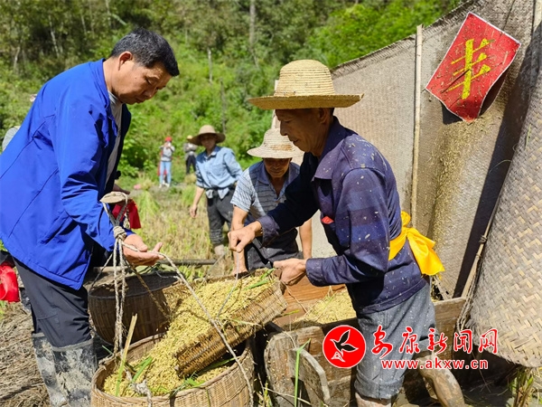 在簡(jiǎn)短的開鐮儀式后,水稻收割正式開始,紅黃兩隊(duì)競(jìng)相角逐。只見金黃的稻田中,村民手持鐮刀一字排開,迅速揮舞著手中的鐮刀,將金黃的稻秧割下并整齊堆放。緊接著兩人一組,交叉替換地將手中的稻秧在拌桶里反復(fù)甩打脫粒,拌谷聲“嘣嘣嘣嘣”有節(jié)奏的作響,一片豐收景象,聲勢(shì)頗為壯觀。