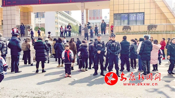 開(kāi)學(xué)當(dāng)天,民警在校園門(mén)口值守。