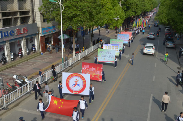 在豪邁的運動員進行曲中,彩旗隊、運動員代表隊、裁判員方隊、文藝表演方隊依次走過主席臺接受檢閱。運動員們鏗鏘有力的步伐、響亮的口號,以颯爽的英姿展示著我縣廣大師生健康向上、團結(jié)進取的良好精神風貌。本屆運動會為期三天,分設(shè)城關(guān)中學、縣體育場兩個賽點,來自全縣各中小學26支代表隊931名運動員將參加籃球、乒乓、田徑三大項共62個小項的比賽,參加本次開幕式文藝表演的學生達2000人,運動會規(guī)模創(chuàng)歷年之最。