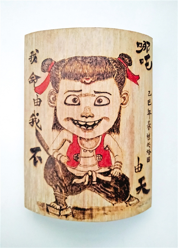 與此同時,在石泉,另一位非遺傳承人也不甘落后,用小小的烙鐵為大家勾勒出了哪吒、申公豹等鮮活的形象。退役軍人楊聰明,身為石泉烙畫非遺代表性傳承人,他微笑著向筆者分享創(chuàng)作初衷:“看到哪吒這個形象如此火爆,孩子也鬧著讓我畫一個,我便也嘗試著拿起了烙鐵。剛開始畫的時候比較隨性,畫出效果后再進行仔細修改。我深知,想要塑造出生動的形象,必須付出大量的時間和精力去精雕細琢。由此我也更加敬佩電影團隊,他們的付出和努力不言而喻。我們都是在用自己的方式,向中華國粹致敬!”