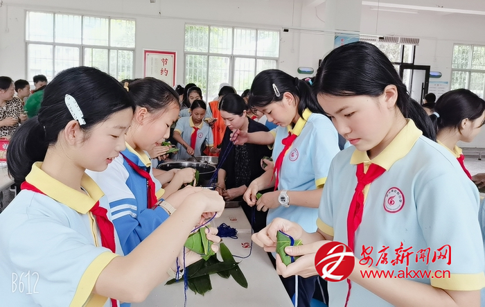 活動(dòng)現(xiàn)場(chǎng),老師與家長(zhǎng)手把手向?qū)W生傳授包粽技巧,從粽葉的折疊角度、糯米的填充分量,到捆扎成形的精細(xì)手法,學(xué)生們圍坐桌前專注練習(xí)。折葉、填米、捆扎……轉(zhuǎn)眼間一個(gè)棱角分明的粽子便成型,現(xiàn)場(chǎng)粽葉翻飛、笑語不斷;顒(dòng)中,老師們還穿插講解端午習(xí)俗,當(dāng)熱氣騰騰的粽子出鍋時(shí),孩子們捧著軟糯香甜的粽子細(xì)細(xì)品嘗,在味蕾的享受中感悟傳統(tǒng)文化的深厚底蘊(yùn)。