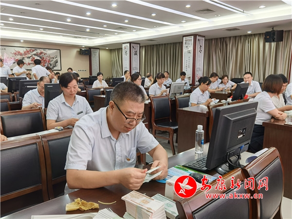 據(jù)了解,此次比賽設(shè)置了翻打百張傳票、字符錄入和手工點鈔、業(yè)務(wù)知識競賽四個項目。在翻打百張傳票和漢字錄入環(huán)節(jié),選手們靈巧的雙手在計算器和鍵盤上游走,伴隨著“噼里啪啦”敲擊聲,只見一個個數(shù)字答案輸入考試系統(tǒng),一行行字符在電腦屏幕上快速跳動。在點鈔比賽中,選手們單指單張、多指多張等多種點鈔手法各顯風采,清點、墩齊、扎把、蓋章,每個步驟都環(huán)環(huán)相扣,一絲不茍,嫻熟的手法讓人目不暇接,印象深刻。