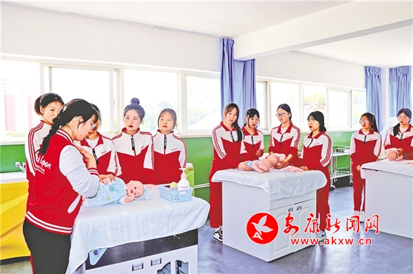 幼兒保育專業(yè)學生在課堂上展示幼兒護理技能。