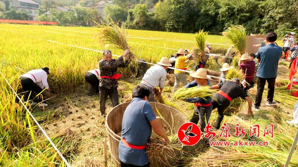 穗滿田頭谷滿倉(cāng),稻魚飄香慶豐年。稻田里,緊張激烈、歡快熱鬧的割稻、甩谷及釣魚比賽正在進(jìn)行,只見(jiàn)一株株水稻隨著鐮刀的刷刷聲倒下,一把把稻穗隨著摔打脫落為金色的谷粒,一條條稻魚在手中躍動(dòng),大家爭(zhēng)分奪秒、你追我趕,一派熱火朝天的景象。
