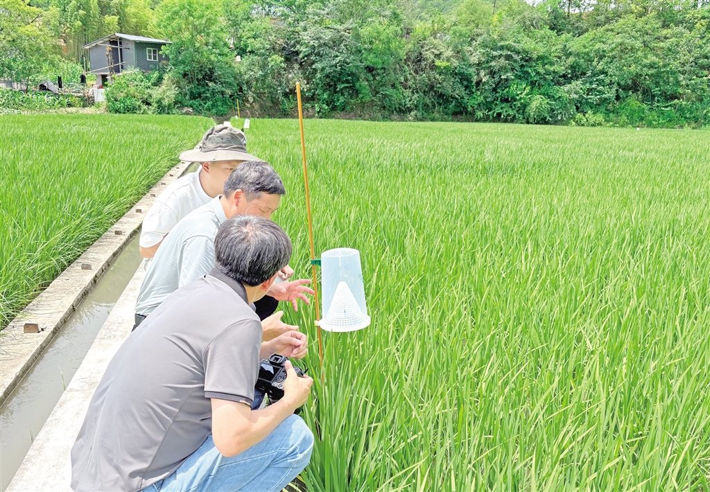 日頭漸漸升高,稻田里的露水被曬成水汽,連片的稻禾舒展著葉片,陽光下泛著健康的碧綠色。黃林權(quán)沿著田壟往前走,每經(jīng)過一個誘捕器就停下來,或調(diào)整角度,或記錄數(shù)量,鞋上的泥點濺到褲腿上也渾然不覺。