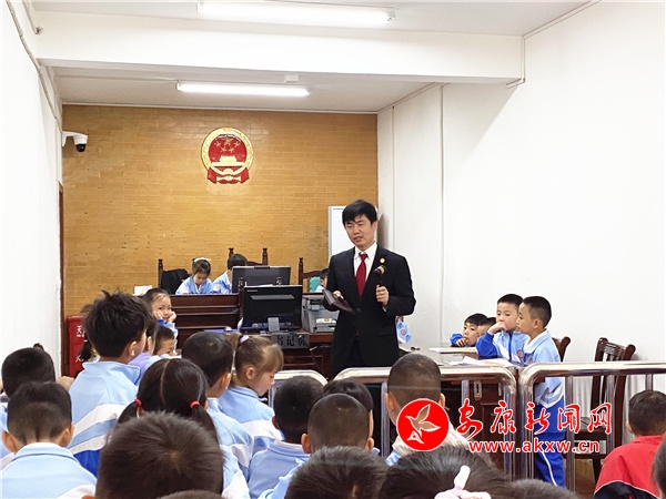 在參觀過(guò)程中,干警帶領(lǐng)同學(xué)們走進(jìn)訴訟服務(wù)中心和干警辦公室了解了法院干警的工作場(chǎng)所。隨后,帶領(lǐng)同學(xué)們參觀審判庭,現(xiàn)場(chǎng)向同學(xué)們介紹科技審判法庭的功能及庭審流程,并展示了法袍、法槌和法徽,同時(shí)用深入淺出的語(yǔ)言和提問(wèn)互動(dòng)的方式向孩子們講解了法袍、法槌和法徽的象征意義,同學(xué)們興趣濃厚,紛紛走上審判臺(tái),親身感受和觸摸審判設(shè)施,感受法庭審判的嚴(yán)肅和莊重。