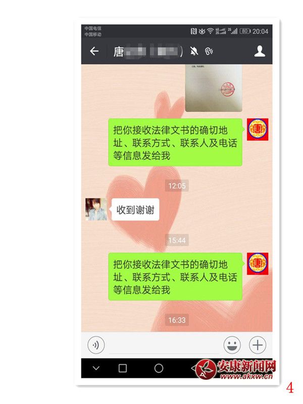 “我們已經(jīng)向你發(fā)送起訴狀副本、應(yīng)訴通知書、開庭傳票、原告提交的證據(jù)材料等,共12張圖片。”“材料已經(jīng)發(fā)送完畢。請(qǐng)確認(rèn)后回復(fù)已收到。”