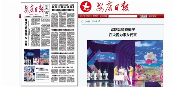 夏梅子曾登上央視宣傳過(guò)安康富硒茶,她在CCTV-3綜藝頻道《幸福賬單》欄目演唱陜南民歌并介紹了紫陽(yáng)富硒茶(綠茶、紅茶)、紫陽(yáng)金錢橘、紫陽(yáng)魔芋干、紫陽(yáng)硒陶等紫陽(yáng)特產(chǎn)。在才藝展示環(huán)節(jié),夏梅子演唱了由著名作家、書法家、中國(guó)作家協(xié)會(huì)會(huì)員、陜西省民間文藝家協(xié)會(huì)專家?guī)斐蓡T曾德強(qiáng)老師創(chuàng)作的《游客醉茶鄉(xiāng)》,她希望更多的人關(guān)注和支持家鄉(xiāng),能夠愛(ài)上安康紫陽(yáng),愛(ài)上紫陽(yáng)富硒茶。