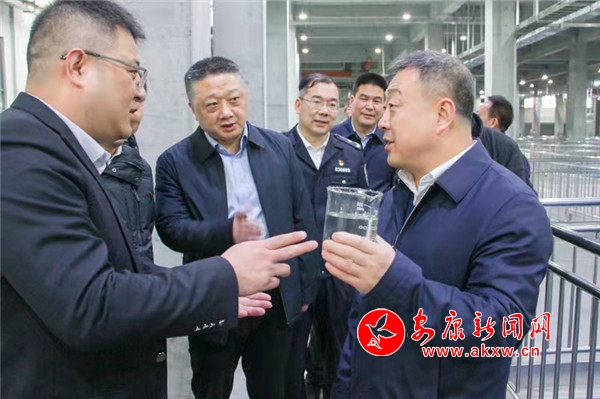 市長武文罡在江南再生水廠調(diào)研,現(xiàn)場查看再生水水質(zhì)情況。