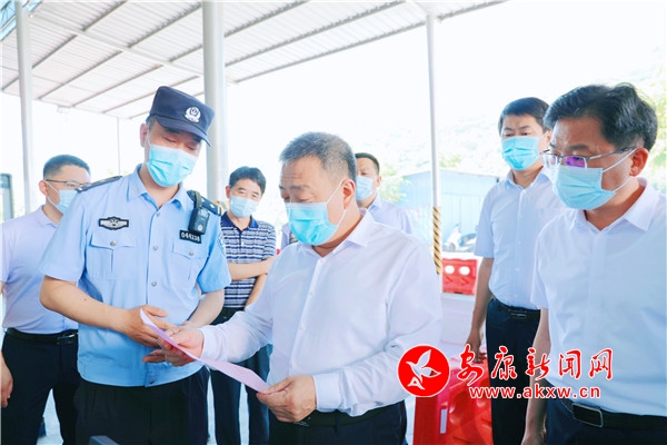 在城關(guān)鎮(zhèn)下卡子省際疫情防控卡點(diǎn),武文罡詳細(xì)了解防控流程、交通查驗(yàn)等情況,對(duì)堅(jiān)守一線的防疫人員表示慰問和感謝。他強(qiáng)調(diào),當(dāng)前我市疫情防控工作總體平穩(wěn),但國內(nèi)疫情形勢依然嚴(yán)峻復(fù)雜,要緊繃思想之弦,杜絕麻痹大意,加強(qiáng)值班值守,耐心細(xì)致做好來返人員掃碼登記、驗(yàn)碼測溫、48小時(shí)內(nèi)核酸檢測陰性證明查驗(yàn)、風(fēng)險(xiǎn)人員“點(diǎn)對(duì)點(diǎn)”轉(zhuǎn)運(yùn)等工作,堅(jiān)決守住外防輸入第一道關(guān)口。在下卡子省際水質(zhì)監(jiān)測站,武文罡強(qiáng)調(diào),要采取有力舉措加強(qiáng)流域綜合治理,強(qiáng)化源頭把控監(jiān)測,確保出陜斷面水質(zhì)持續(xù)向好、穩(wěn)定達(dá)標(biāo)。
