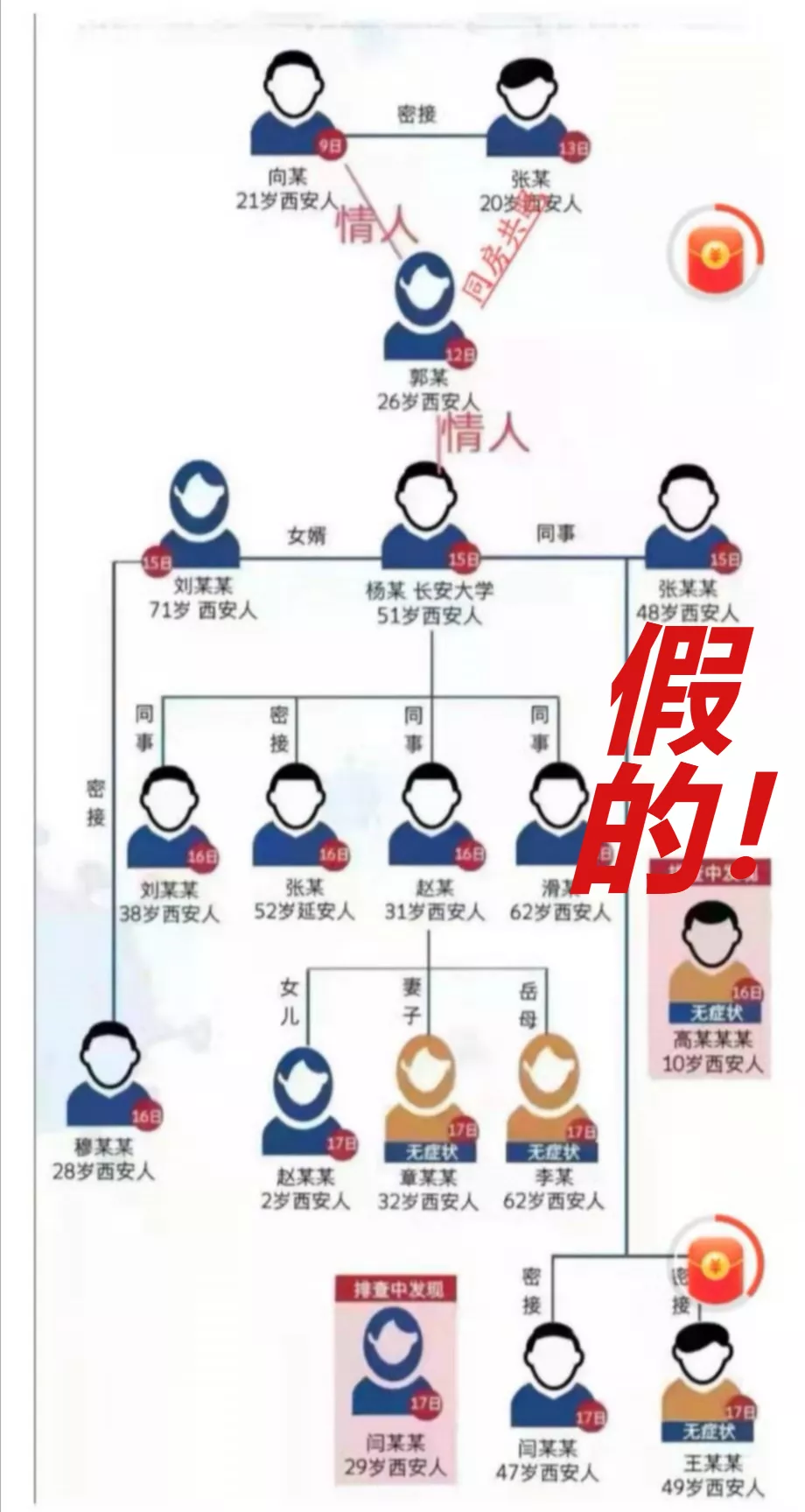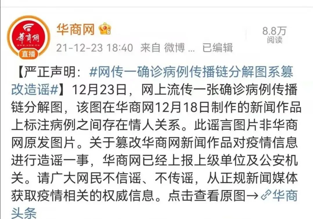 網(wǎng)上流傳一張確認(rèn)病例傳播鏈分解圖,在病例之間標(biāo)注“情人”關(guān)系,并傳言此次疫情傳播因素之一,是因?yàn)槲靼彩桌±c子牛門診的護(hù)士為情人關(guān)系,導(dǎo)致疫情擴(kuò)散,經(jīng)核實(shí),該圖盜用華商網(wǎng)12月18日制作的新聞作品圖片。該信息為虛假信息,造謠的人已被拘留。