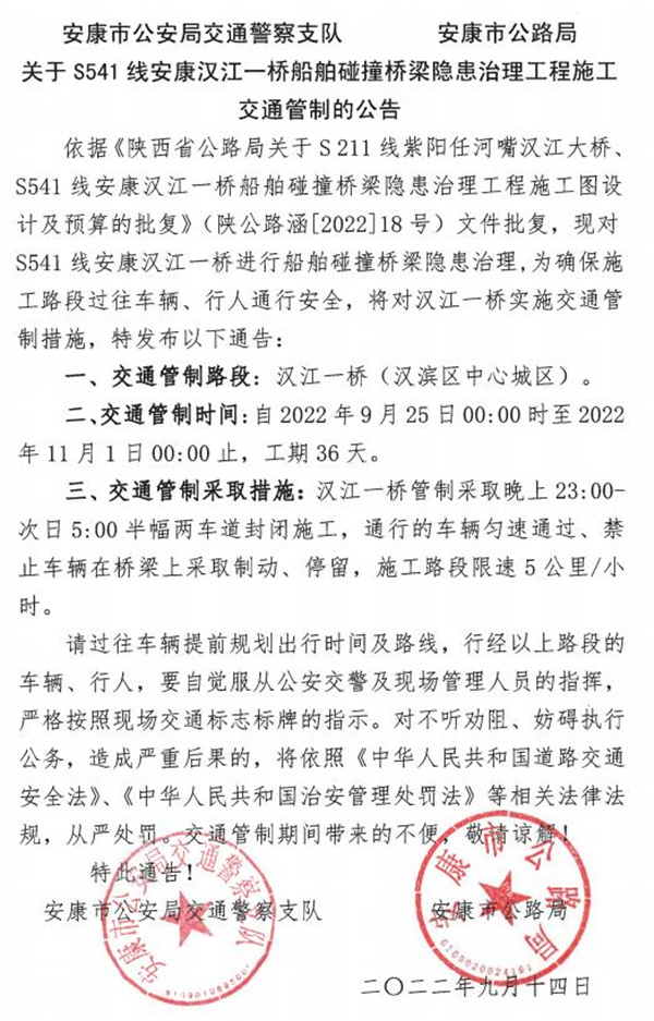 9月25日至11月1日安康漢江一橋?qū)⑦M行船舶碰撞橋梁隱患治理工程施工,將對漢江一橋?qū)嵭?strong>交通管制36天,管制采取晚上23:00-次日5:00半幅兩車道封閉施工,通行的車輛勻速通過,禁止車輛在橋梁上采取制動、停留,施工路段限速5公里/小時。qmU安康新聞網(wǎng)