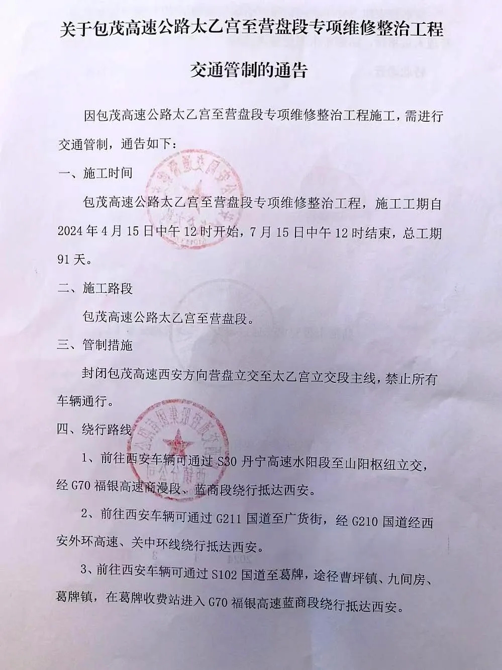 4月15日12時(shí)起,包茂高速公路太乙宮至營(yíng)盤段交通管制