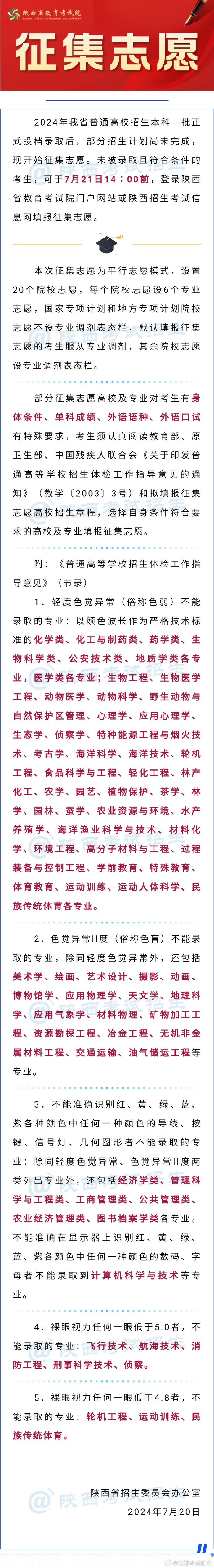 2024年我省普通高校招生本科一批正式投檔錄取后,部分招生計(jì)劃尚未完成,現(xiàn)開(kāi)始征集志愿。未被錄取且符合條件的考生,可于7月21日14∶00前,登錄陜西省教育考試院門(mén)戶網(wǎng)站或陜西招生考試信息網(wǎng)填報(bào)征集志愿。F2b安康新聞網(wǎng)