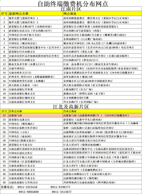 為進(jìn)一步方便廣大用戶購(gòu)買天然氣,我公司在電信營(yíng)業(yè)廳、建設(shè)銀行、農(nóng)商銀行及便民服務(wù)點(diǎn)等網(wǎng)點(diǎn)布設(shè)38臺(tái)天然氣自助終端繳費(fèi)機(jī),F(xiàn)溫馨提示您關(guān)注“安康市逸華天然氣有限公司”微信公眾號(hào)查看自助機(jī)分布網(wǎng)點(diǎn),選擇就近網(wǎng)點(diǎn)進(jìn)行天然氣充值。其他業(yè)務(wù)可在工作時(shí)間內(nèi)前往以下人工服務(wù)大廳或窗口辦理,部分業(yè)務(wù)也可通過(guò)微信公眾號(hào)的“微營(yíng)業(yè)廳”辦理:
