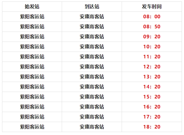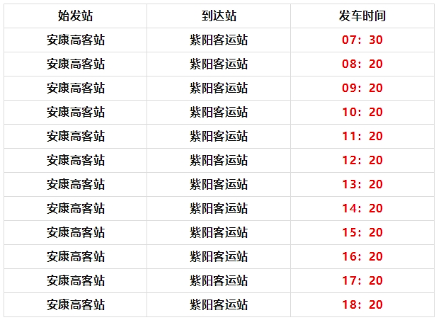 由安康高速客運(yùn)站發(fā)往紫陽汽車站,每日12班,發(fā)車時間為: jhu安康新聞網(wǎng)