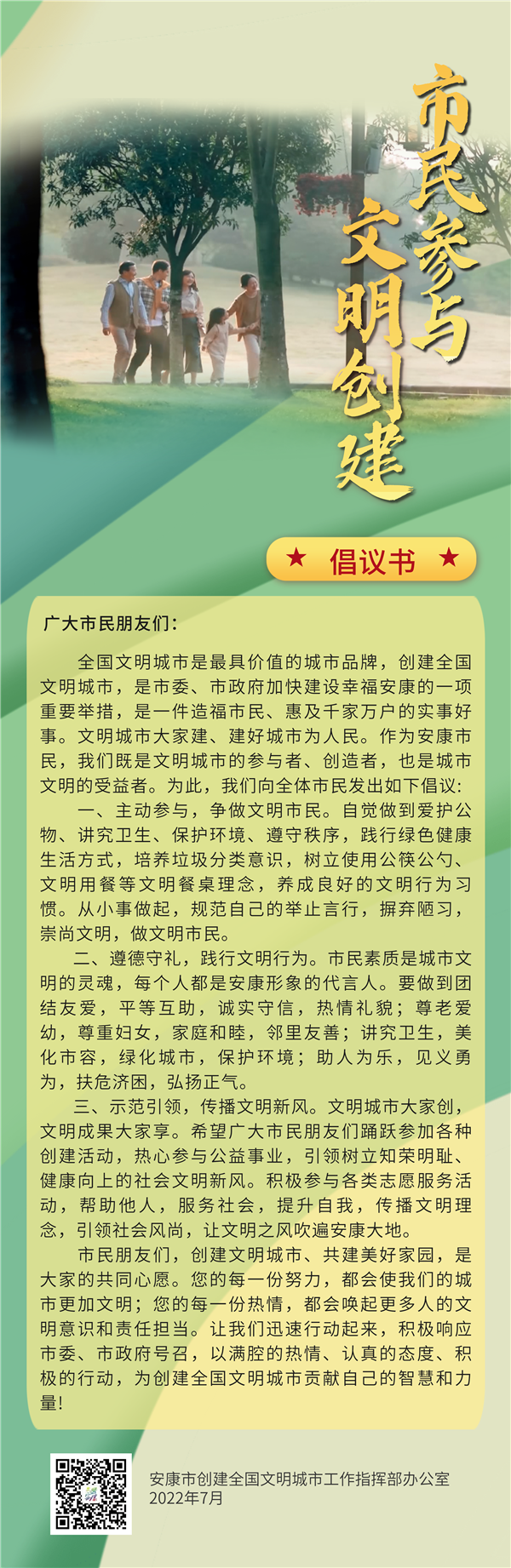 全國(guó)文明城市是最具價(jià)值的城市品牌,創(chuàng)建全國(guó)文明城市,是市委、市政府加快建設(shè)幸福安康的一項(xiàng)重要舉措,是一件造福市民、惠及千家萬(wàn)戶的實(shí)事好事。文明城市大家建、建好城市為人民。作為安康市民,我們既是文明城市的參與者、創(chuàng)造者,也是城市文明的受益者。為此,我們向全體市民發(fā)出如下倡議: