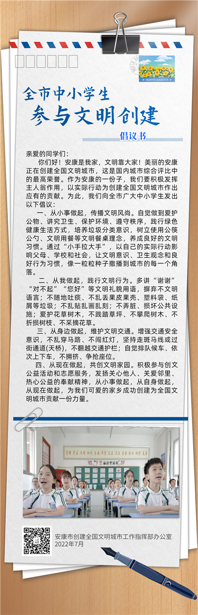 你們好!安康是我家,文明靠大家!美麗的安康正在創(chuàng)建全國文明城市,這是國內(nèi)城市綜合評比中的最高榮譽(yù)。作為安康的一份子,我們要積極發(fā)揮主人翁作用,以實(shí)際行動(dòng)為創(chuàng)建全國文明城市作出應(yīng)有的貢獻(xiàn)。為此,我們向全市廣大中小學(xué)生發(fā)出以下倡議: