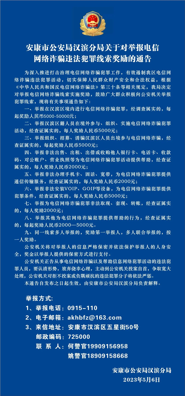 安康市公安局漢濱分局關(guān)于對(duì)舉報(bào)電信網(wǎng)絡(luò)詐騙違法犯罪線索獎(jiǎng)勵(lì)的通告