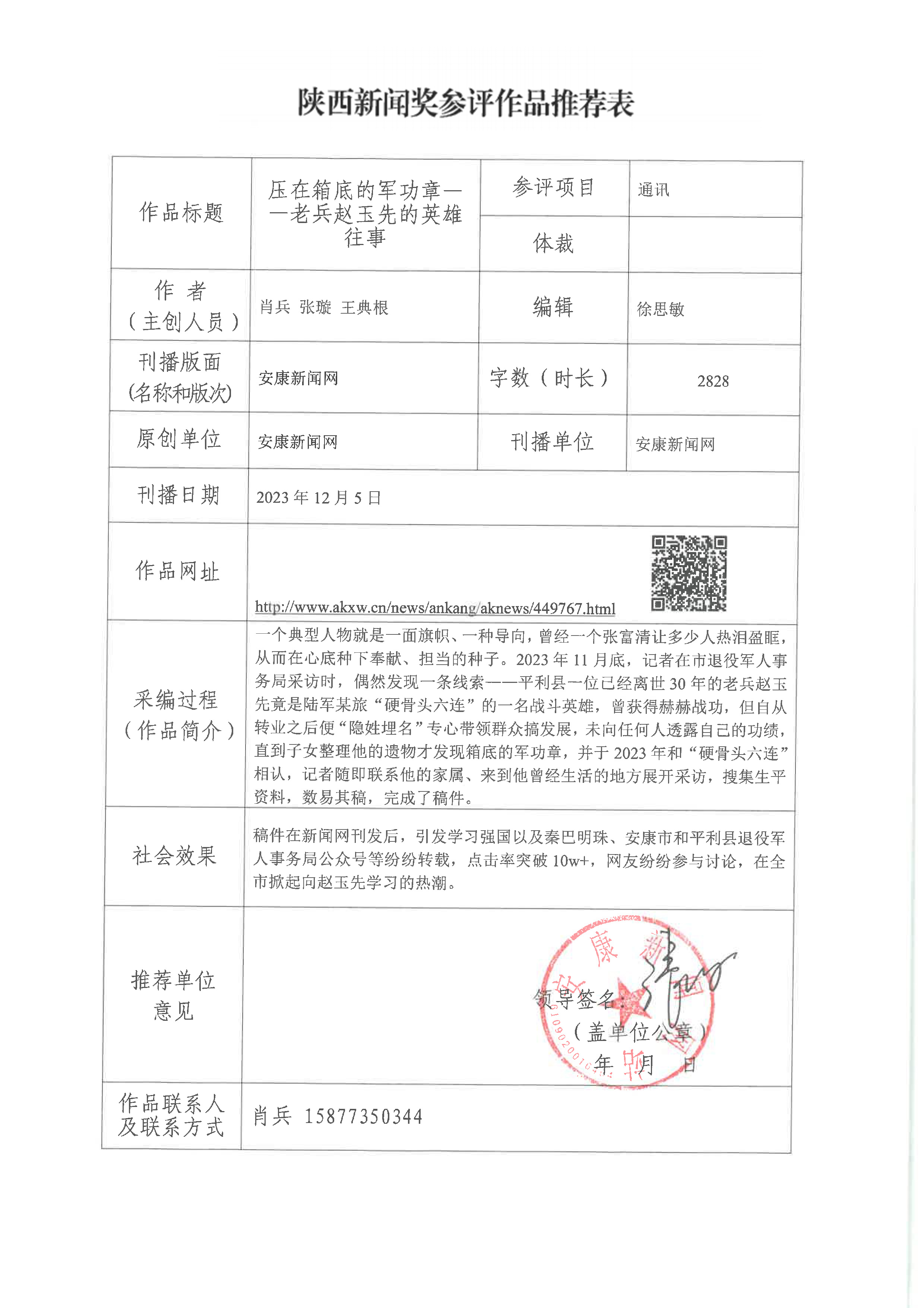 經過1月30日編委會推薦、社黨委研究決定,擬推薦以下4件新聞作品參評2023年度“陜西新聞獎”。公示時間從2024年3月6日至2024年3月12日,公示期為5個工作日。如有不同意見,請向安康日報社機關紀委、新聞管理部反映。RAj安康新聞網