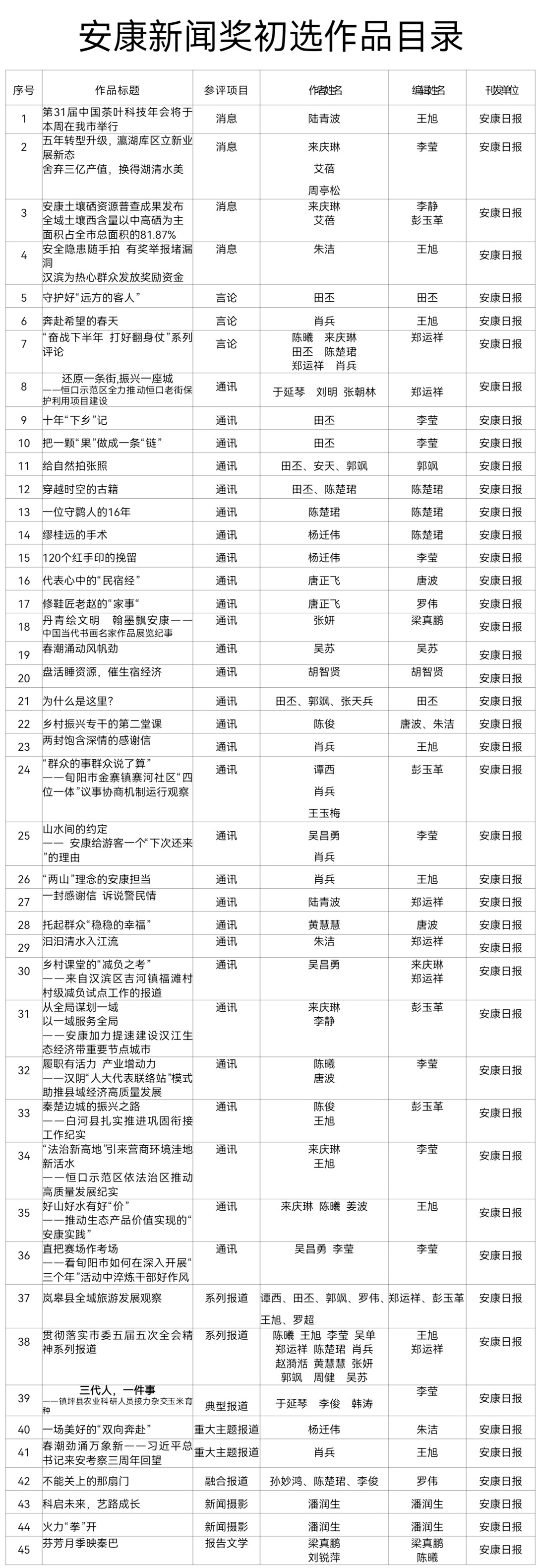 經(jīng)過(guò)3月20日編委會(huì)推薦、社黨委研究決定,擬推薦以下45件新聞作品參評(píng)2023年度“安康新聞獎(jiǎng)”。公示時(shí)間從2024年3月21日至2024年3月27日,公示期5個(gè)工作日。如有不同意見(jiàn),請(qǐng)向安康日?qǐng)?bào)社機(jī)關(guān)紀(jì)委、新聞管理部反映。waq安康新聞網(wǎng)