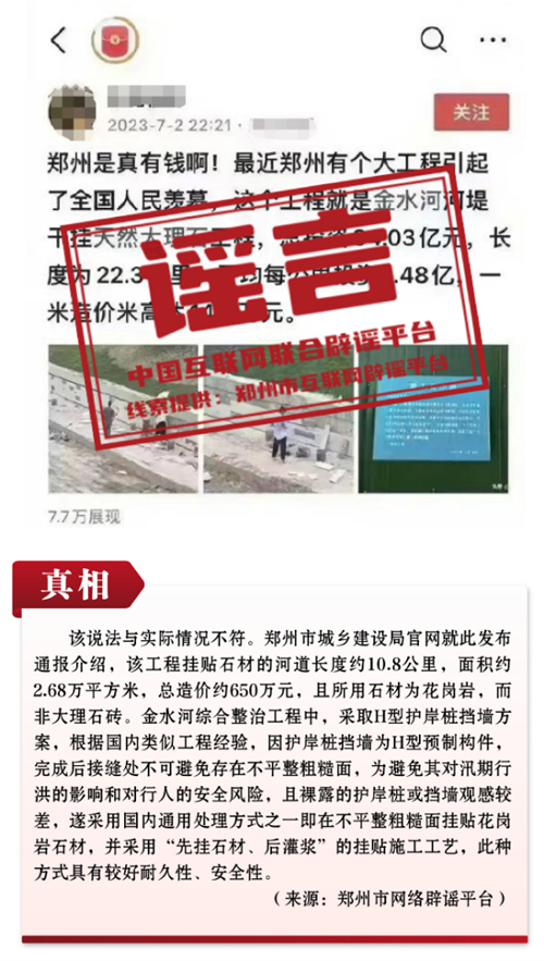 謠言7:鄭州花34億給22公里河道貼大理石磚?