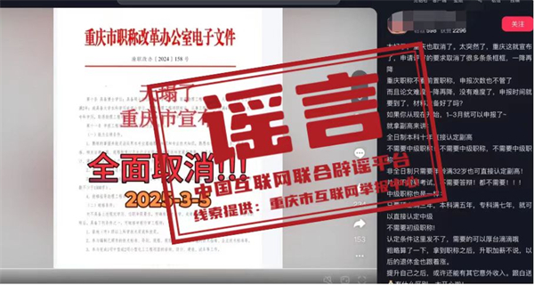 真相:近日,有網(wǎng)民在互聯(lián)網(wǎng)平臺發(fā)布消息稱“重慶市宣布,申請評審的要求取消了很多條條框框,職稱申請不看前置職稱,全日制本科十年直接認定副高,不需要中級職稱”,引發(fā)關注。經(jīng)核實,網(wǎng)傳信息系謠言。職稱評審均需逐級晉升,取得上一級職稱并滿足相應學歷資歷條件后方可晉升高一級職稱。目前重慶市除特殊人才、博士后等3個針對特定對象的職稱申報綠色通道外,正常申報通道均需逐級晉升。網(wǎng)傳文件是網(wǎng)民通過P圖軟件編輯而成,試圖吸引不明真相的群眾咨詢,借機推銷職稱代辦服務,收取高額費用。目前,謠言線索已轉(zhuǎn)交公安機關進一步調(diào)查處置。(來源:“重慶辟謠”微信公眾號)