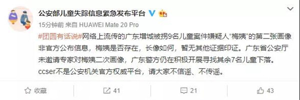 網(wǎng)絡(luò)上流傳的廣東增城被拐9名兒童案件嫌疑人“梅姨”的第二張畫(huà)像非官方公布信息,梅姨是否存在,長(zhǎng)像如何,暫無(wú)其他證據(jù)印證。廣東省公安廳未邀請(qǐng)專家對(duì)梅姨二次畫(huà)像,廣東警方仍在積極開(kāi)展尋找其余7名兒童下落。ccser不是公安機(jī)關(guān)官方權(quán)威平臺(tái),請(qǐng)大家不信謠、不傳謠。