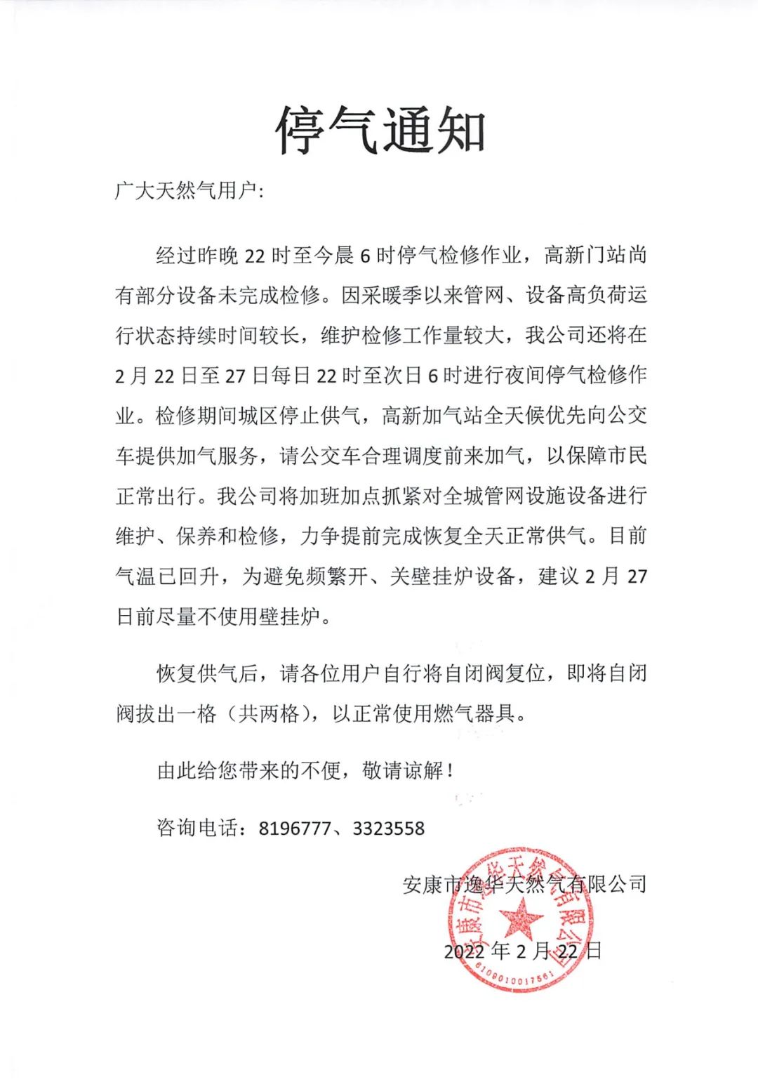 2月22日至27日每日22時(shí)至次日6時(shí),城區(qū)停止供氣