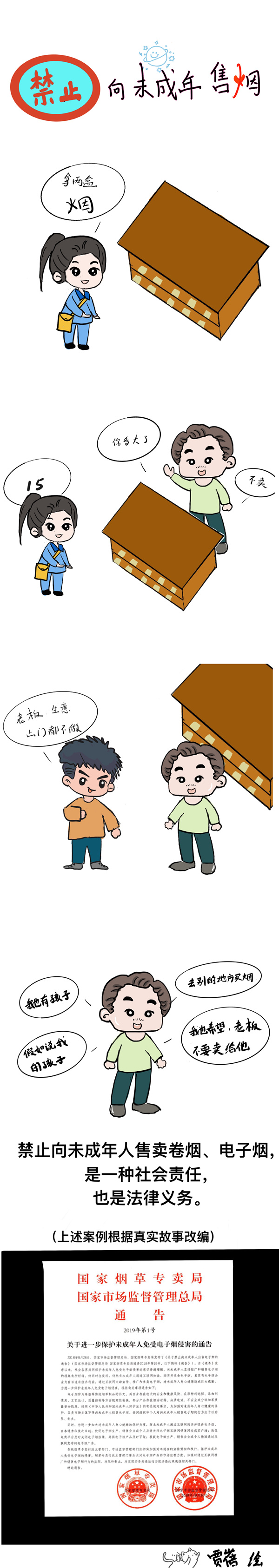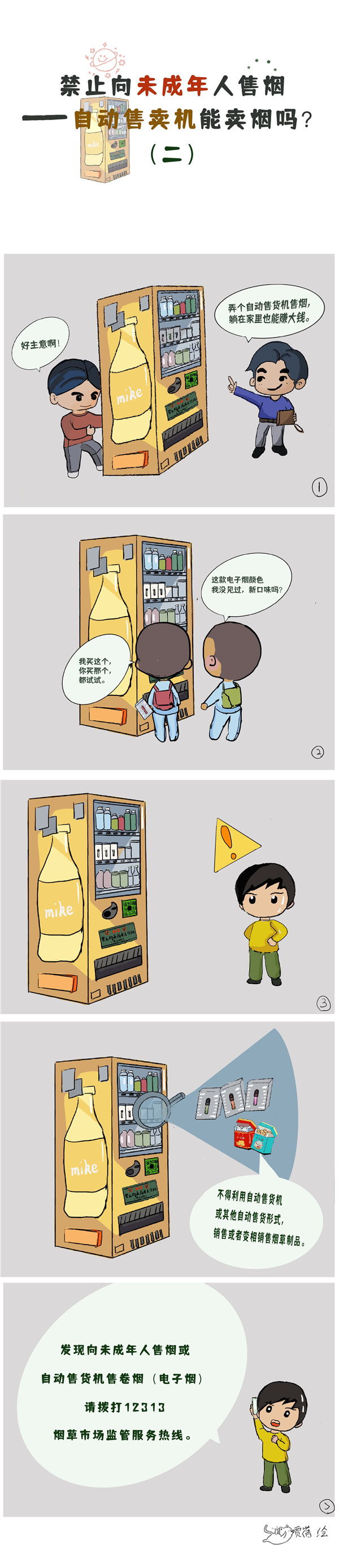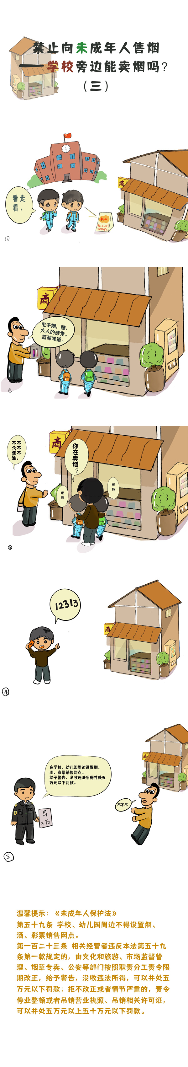 《中華人民共和國(guó)未成年人保護(hù)法》中提到禁止向未成年人售煙,那么生活中遇到這些情況我們?cè)撛趺醋瞿??qǐng)看下列漫畫。(賈蓓 繪制)